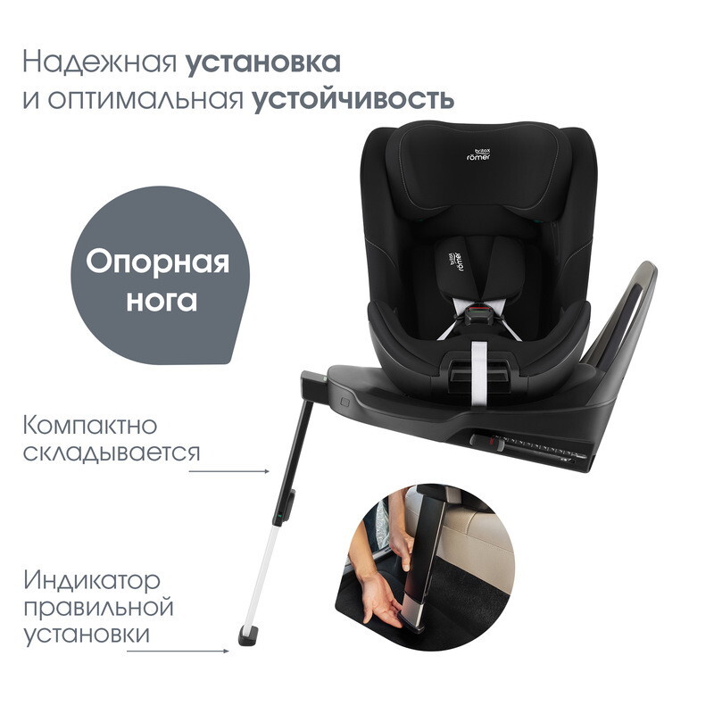 Надёжная установка автокресла SWIVEL с помощью регулируемой опорной ноги. Нога фиксируется в пол автомобиля, обеспечивая дополнительную устойчивость и сводя к минимуму перекос и смещение автокресла. За счёт специального индикатора легко понять, когда опорная нога плотно прижата к полу салона автомобиля, что облегчает правильную установку.