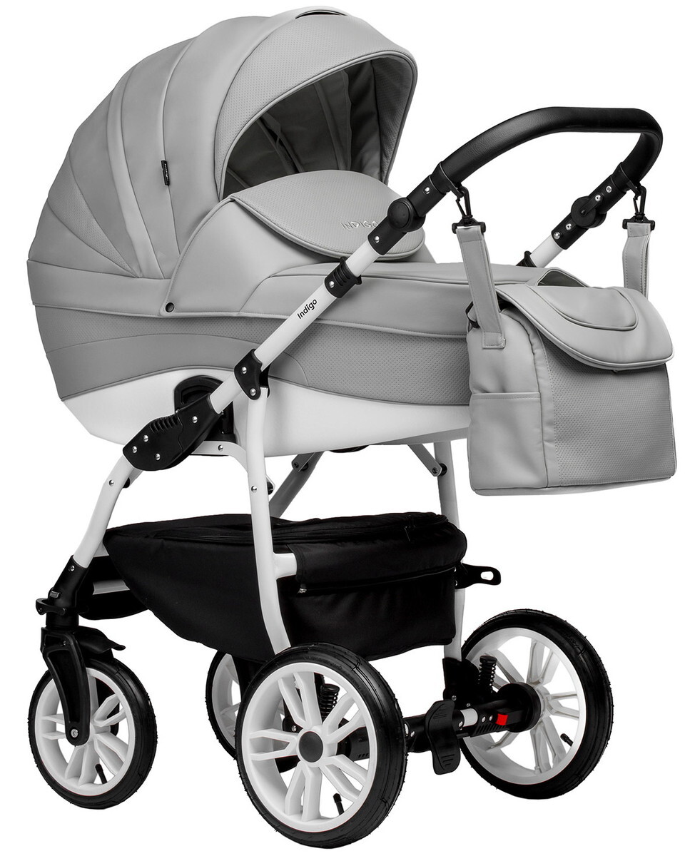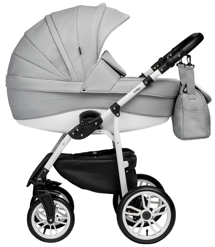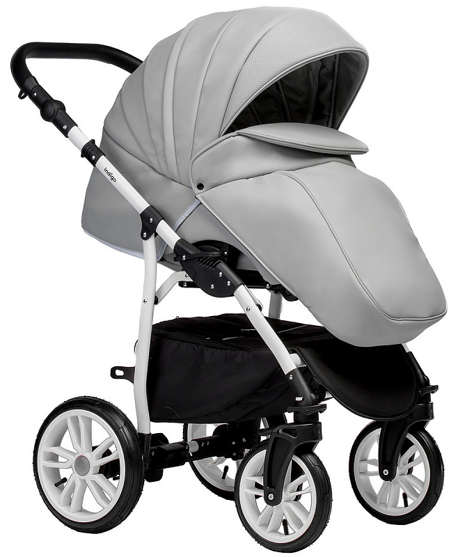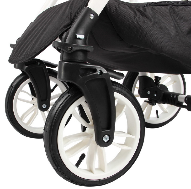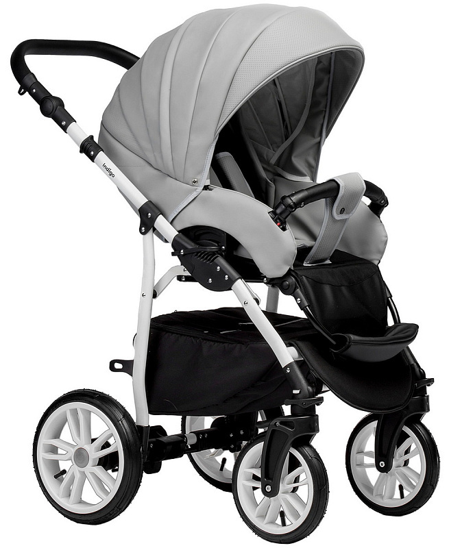 Детская коляска изготовлена из качественных и безопасных материалов. Люлька состоит из литого пластика, внутренний чехол произведен из натурального хлопка. Шасси оснащены центральным задним тормозом, пружинными амортизаторами. Прогулочный блок имеет регулируемые подножку, спинку и капюшон.