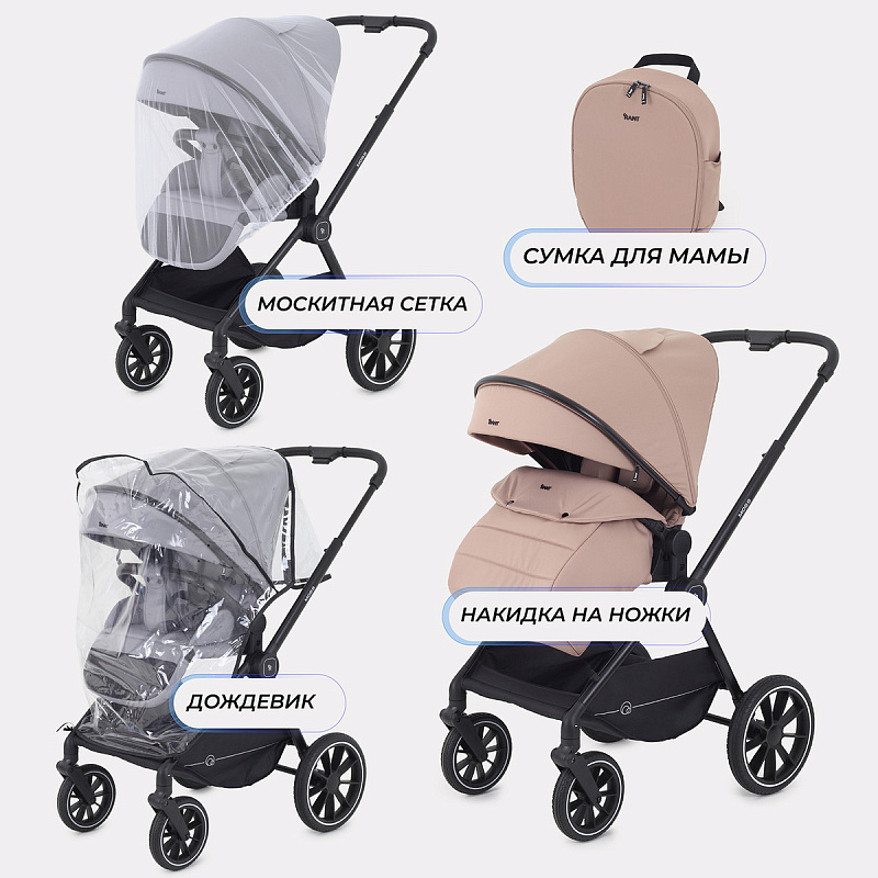 - модель дополнена богатой комплектацией: стильным рюкзаком для мамы, москитной сеткой, дождевиком