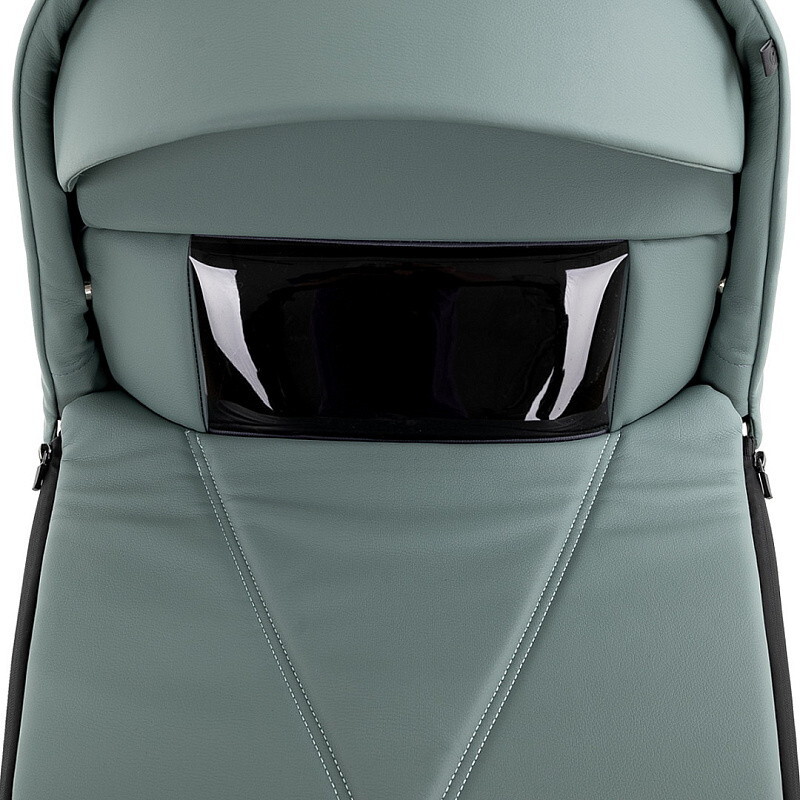 Накидка на люльку имеет дополнительный отворот со смотровым окном, сам отворот полностью закрывает ребенка от непогоды и крепится за счёт магнитов.