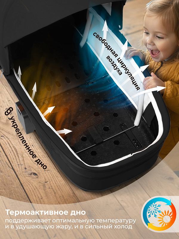 Уникальное термоактивное дно люльки поддерживает оптимальную температуру, позволяя вашему ребенку наслаждаться свежим воздухом и уютом даже в самые прохладные дни. Вентиляционные окошки для проветривания люльки оснащены утепленными вставками, которые легко отстегиваются при наступлении тепла, обеспечивая идеальный климат для вашего малыша. Обратите внимание на новые увеличенные колеса из высокомолекулярного полимера, аналогичных тем, что используются в кроссовках Nike. Эти колеса гарантируют отличную амортизацию и сцепление с различными покрытиями, что делает каждую прогулку плавной и комфортной. Даже на неровных поверхностях ваш малыш не почувствует ни малейшего дискомфорта, а родителям будет легко управлять коляской благодаря высокоэффективной амортизации как передних, так и задних колес.