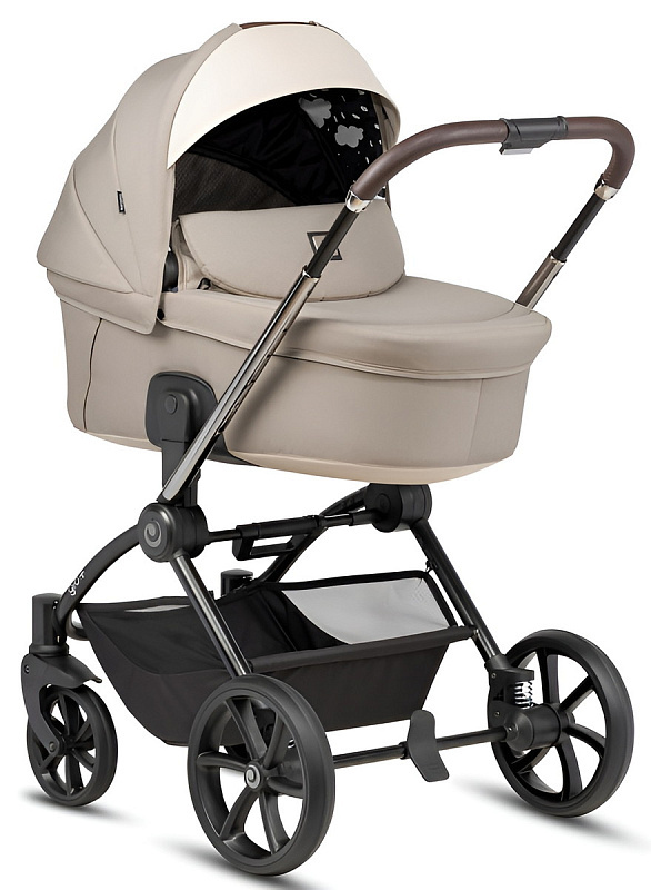 Ручка коляски покрыта мягкой экокожей и регулируется телескопически, чтобы подстроиться под разный рост родителей. Тормозная система выполнена в виде двусторонней педали, которая не пачкает вашу обувь. Вместительная корзина для покупок с сетчатыми бортиками легко доступна независимо от положения спинки сиденья.
