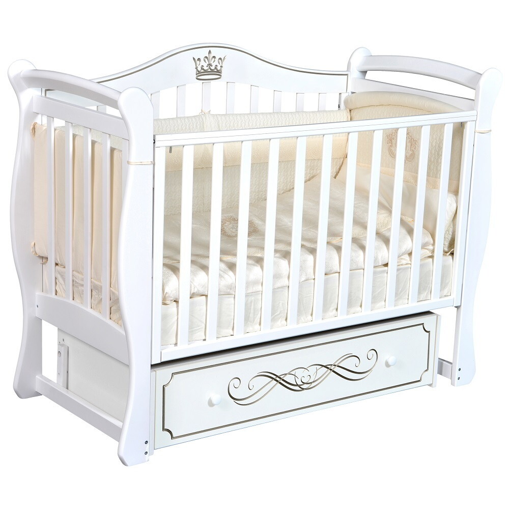Роскошный современный дизайн с фигурными боковыми спинками, а также задней изогнутой спинкой. Декоративная резьба в виде Короны на задней стенке. Универсальный маятник с функцией продольного либо поперечного качания. Маятник фиксируется или снимается. Можно поставить кровать на ножки. Передняя стенка опускается с помощью подпружиненных курков и имеет два положения по высоте для свободного доступа к новорожденному малышу. Легко трансформируется в диванчик.