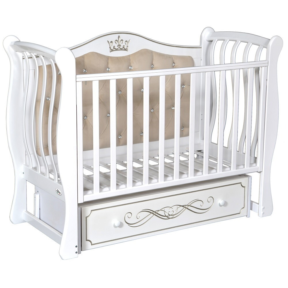 Кроватка с мягкой обивкой на задней стенке. Украшена стразами и резьбой в виде короны. Укомплектована универсальным маятником, что позволяет собрать кроватку с функцией продольного или поперечного качания. Маятниковый механизм можно зафиксировать и использовать кроватку как качалку или поставить на ножки. Передняя стенка опускается с помощью подпружиненных курков и имеет два положения по высоте. В дальнейшем ее можно снять, ложе опустить в самое нижнее положение, и кроватка превратится в диванчик. Реечное ложе регулируется по высоте в двух положениях. Имеется закрытый ящик.