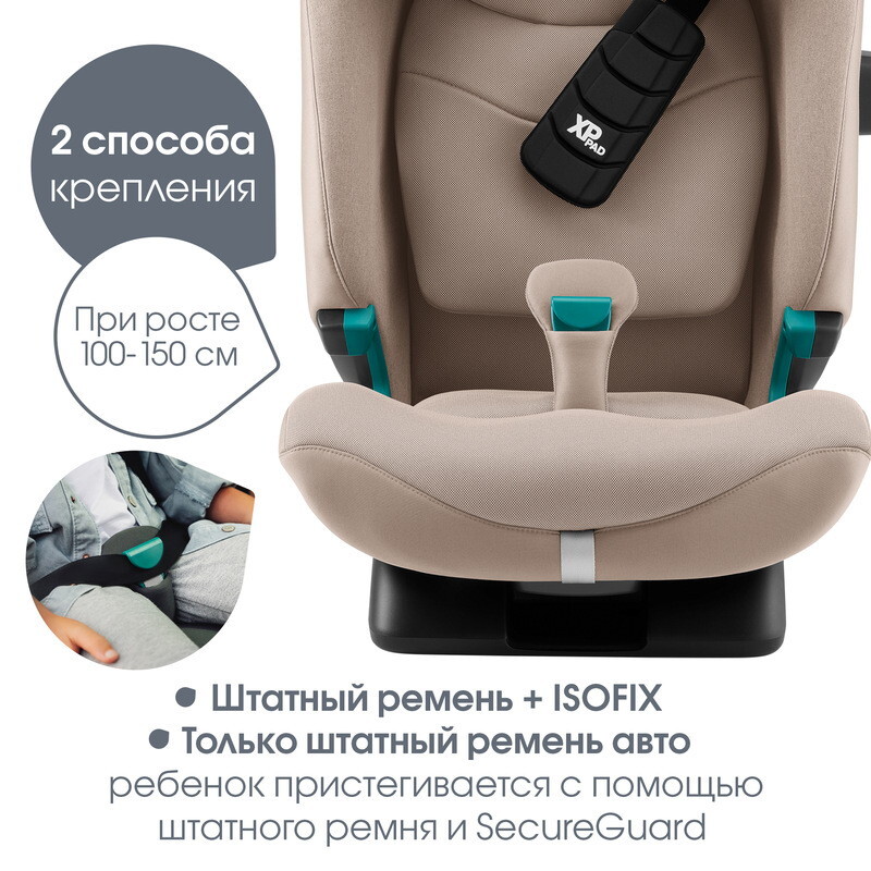 • Амортизирующая подушка XP-Pad защитит малыша при лобовом ударе. В случае аварии она уменьшает движение головы вперед на 30%*, предотвращая удар головы ребенка о грудную клетку. XP-Pad делает каждую поездку более комфортной, смягчая давление ремня безопасности на нежную кожу ребенка.