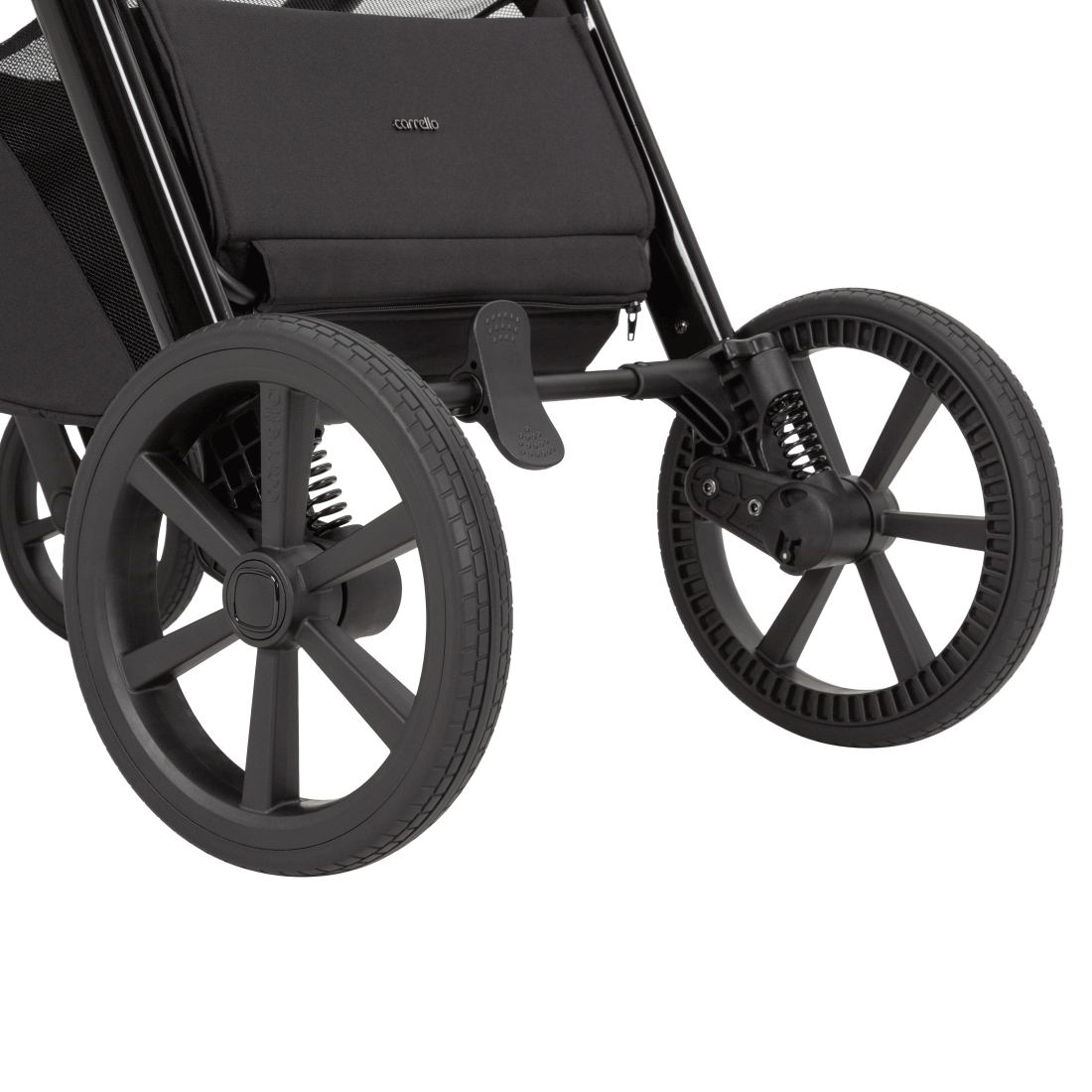 Рама коляски выполнена из алюминия, что делает ее легкой и устойчивой к воздействиям окружающей среды. Шлифованная обработка рамы придает ей эстетичный внешний вид. Амортизация на задней оси шасси имеет двухступенчатую регулировку, что обеспечивает удобство при передвижении по неровной местности. Антишоковая амортизация передних колес поглощает вибрации, смягчая удары при попадании колеса в ямку или препятствие. Адаптеры позволяют установить люльку на более высоком уровне. LED-фонарь с тремя режимами света (сильный, средний и проблесковый) обеспечивает безопасность в темное время суток. Коляска также может заряжаться через USB-порт.