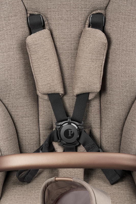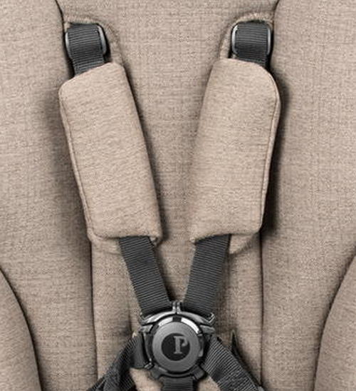 Просторное сиденье оснащено пятиточечными ремнями безопасности с мягкими накладками и системой защелкивания, расстегнуть которую могут только родители.