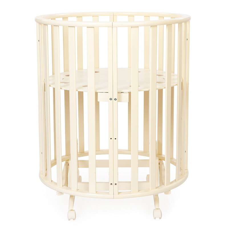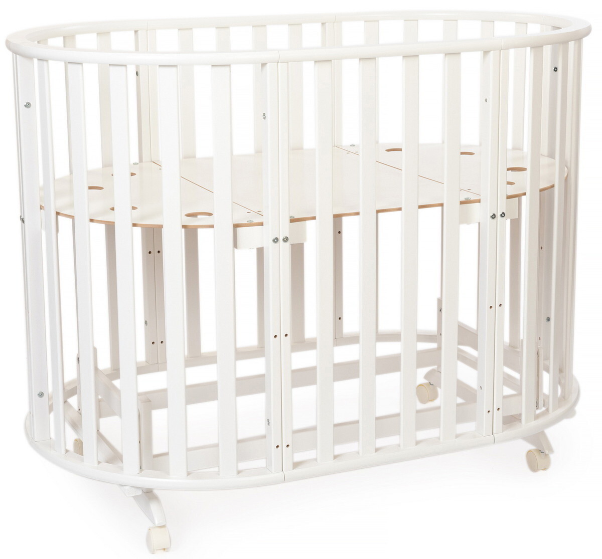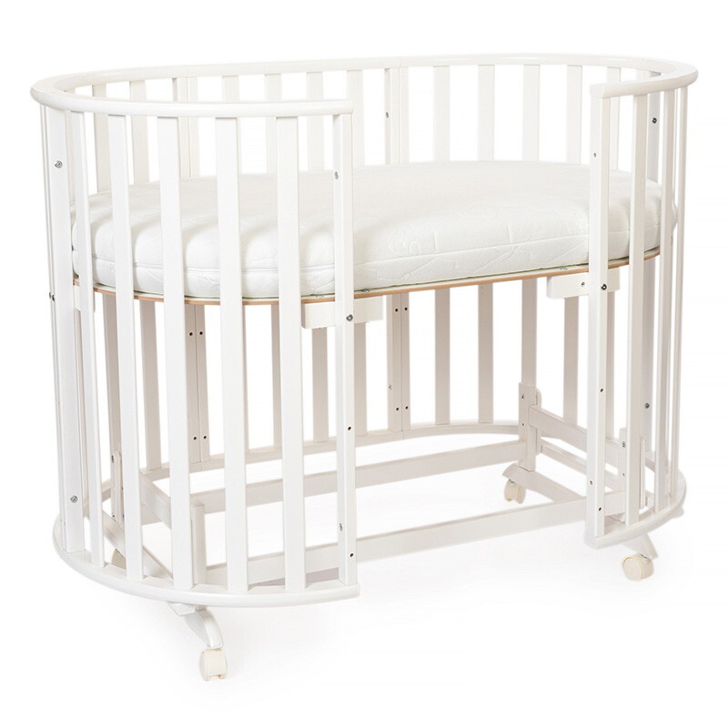 Кроватка 5 в 1 овальной формы для новорожденного малыша. Стильный дизайн кроватки впишется в любой интерьер. Каркас выполнен из массива берёзы. Маятник поперечного качания поможет укачать малыша. Колёсики в комплекте для удобного перемещения по комнате. Когда ребенок подрастет, можно полностью снять боковую стенку и кроватка превратится в диванчик.