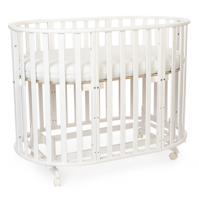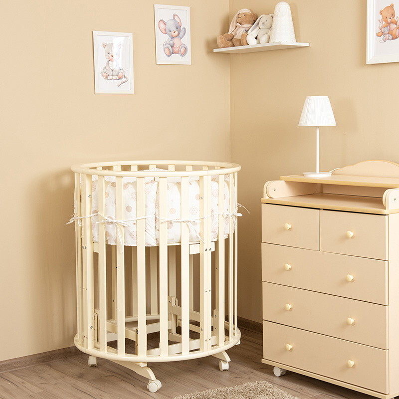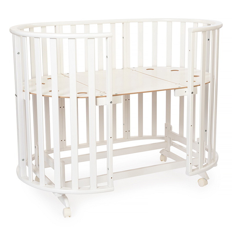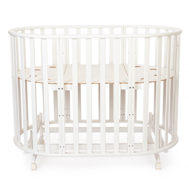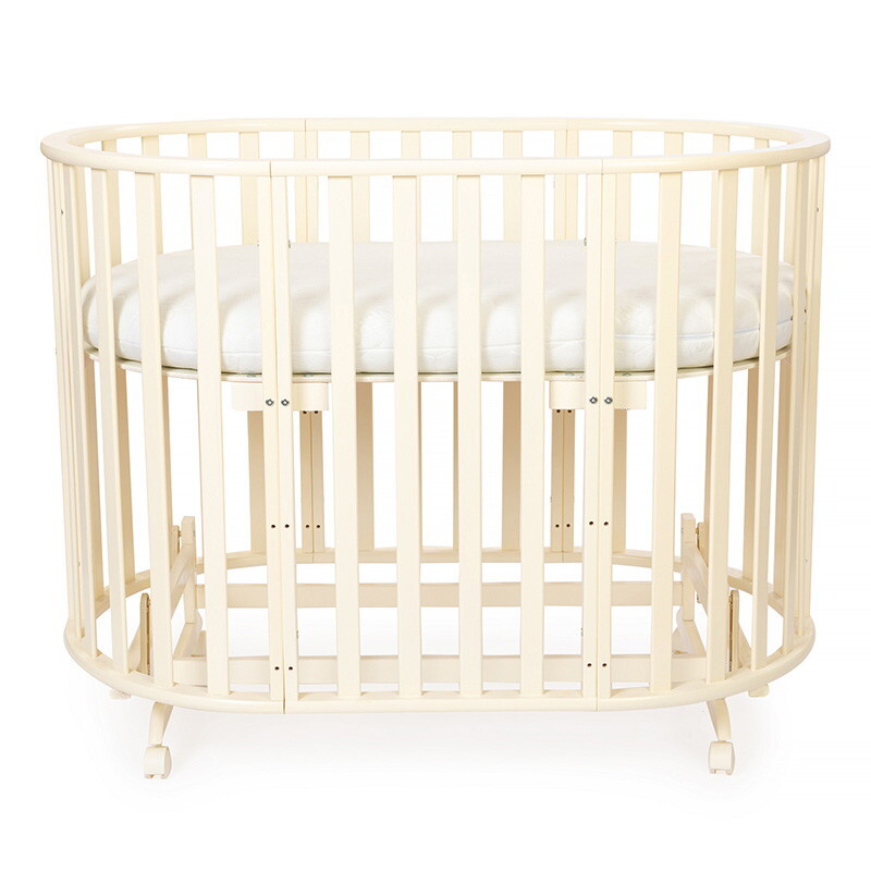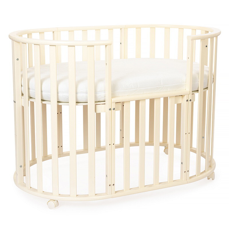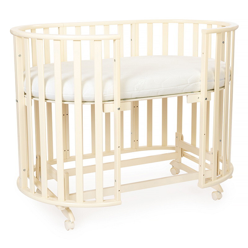 Кроватка 5 в 1 овальной формы для новорожденного малыша. Стильный дизайн кроватки впишется в любой интерьер. Каркас выполнен из массива берёзы. Маятник поперечного качания поможет укачать малыша. Колёсики в комплекте для удобного перемещения по комнате. Когда ребенок подрастет, можно полностью снять боковую стенку и кроватка превратится в диванчик.