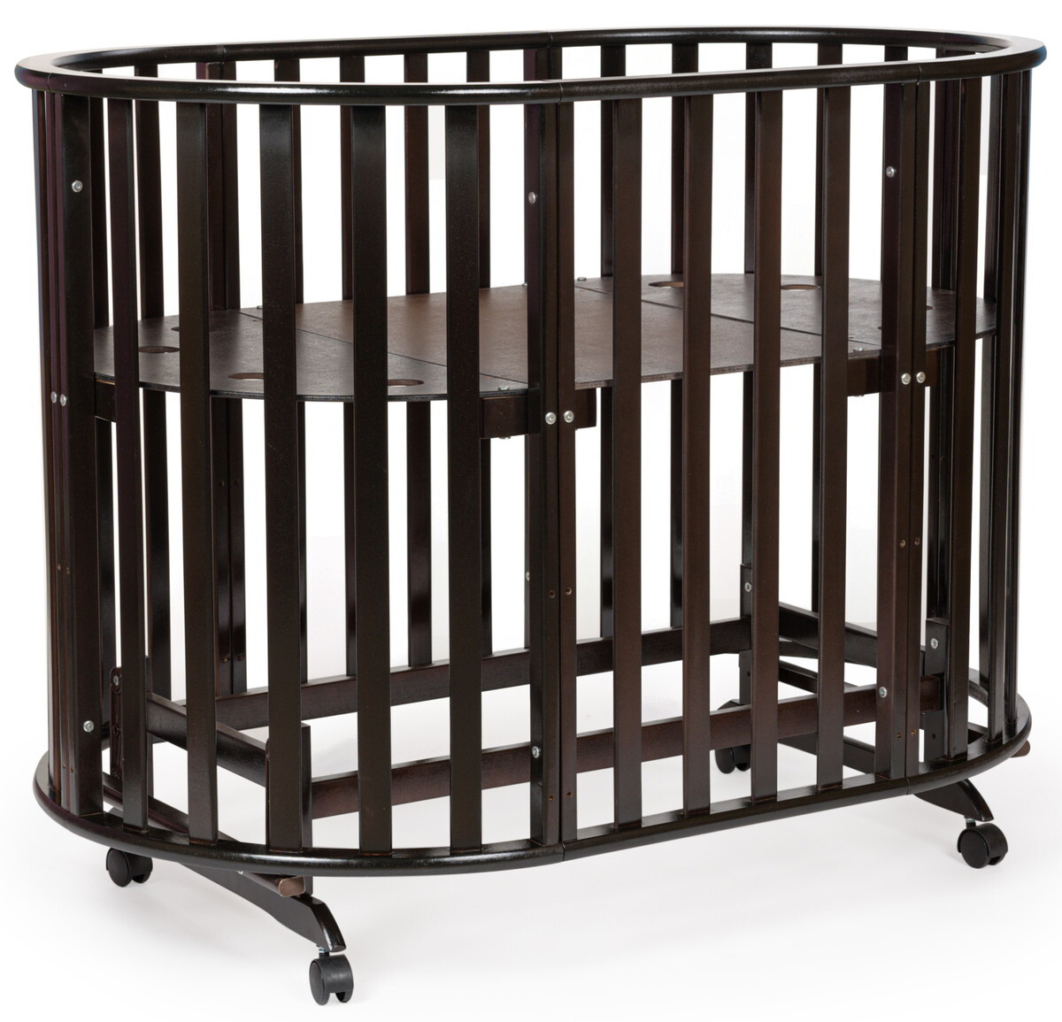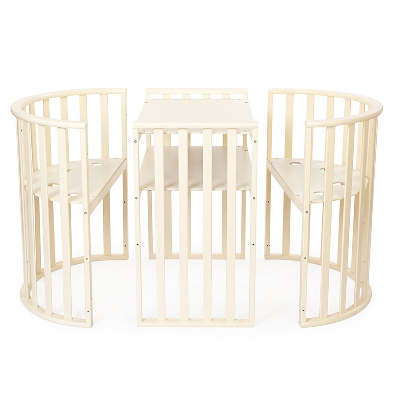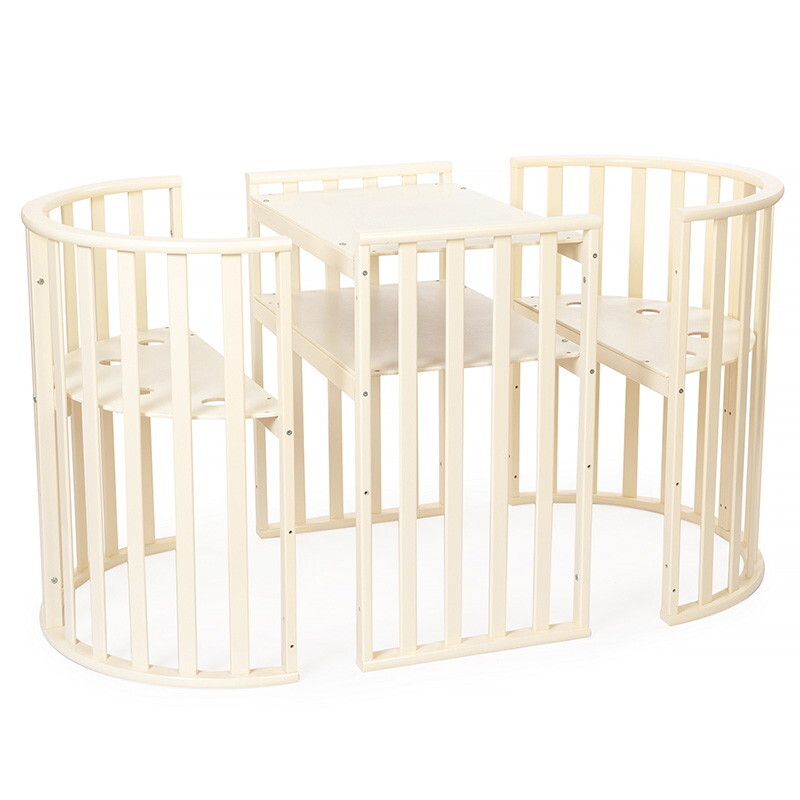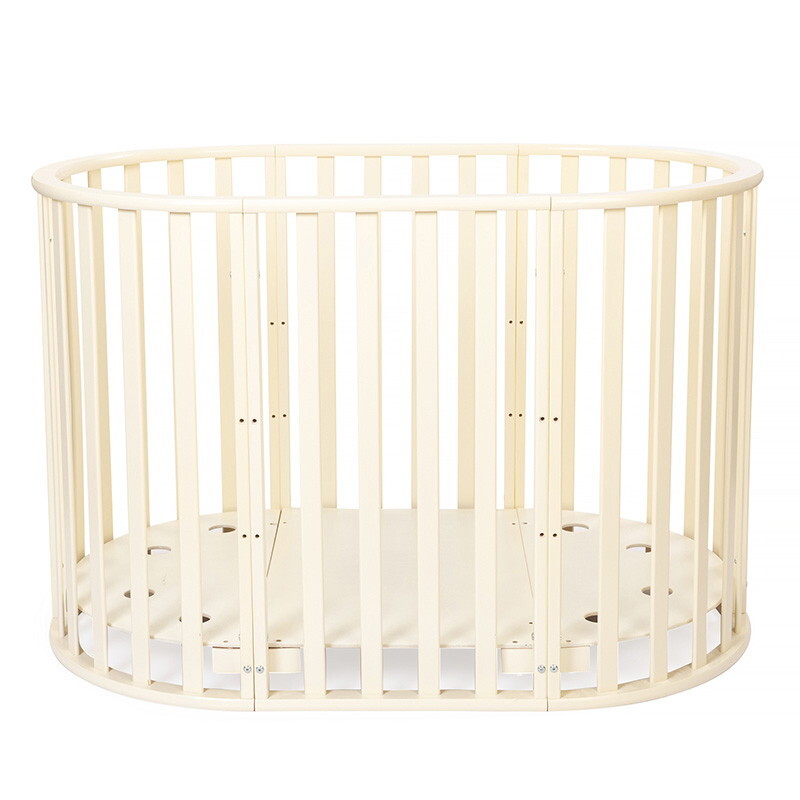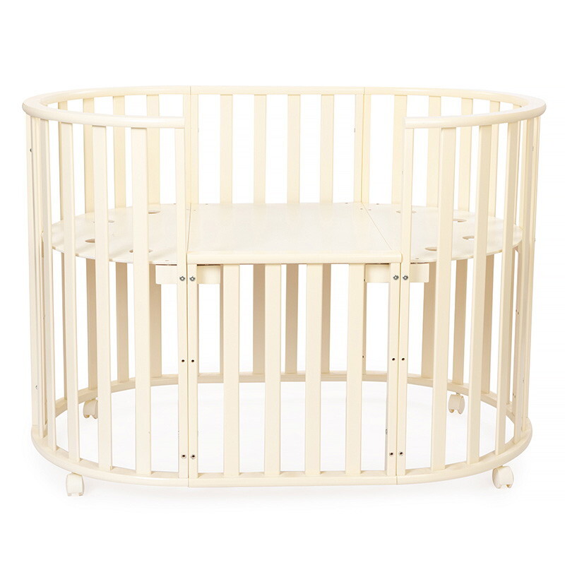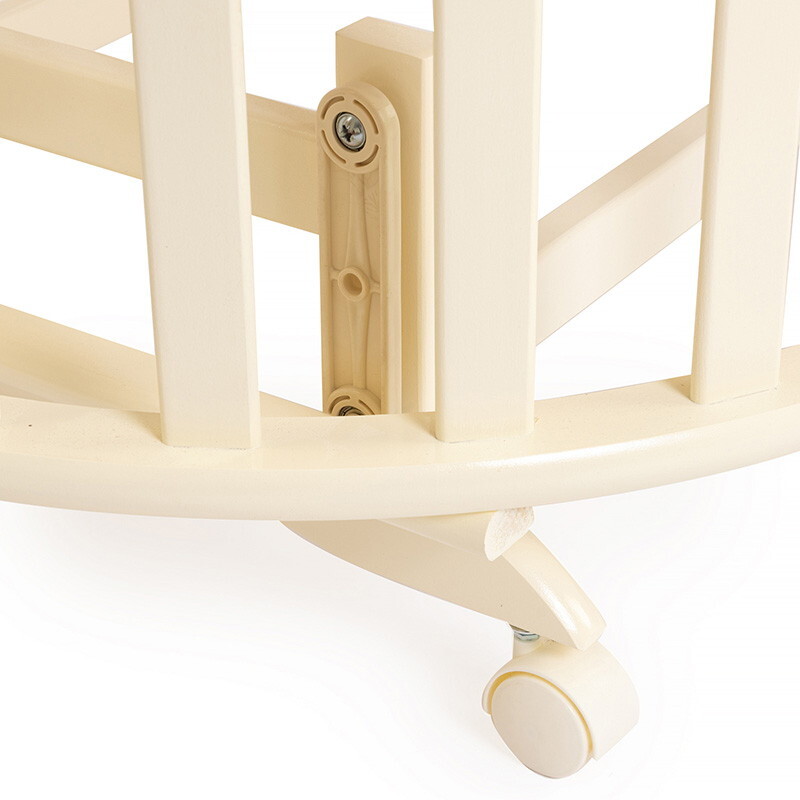 Кроватка 5 в 1 овальной формы для новорожденного малыша. Стильный дизайн кроватки впишется в любой интерьер. Каркас выполнен из массива берёзы. Маятник поперечного качания поможет укачать малыша. Колёсики в комплекте для удобного перемещения по комнате. Когда ребенок подрастет, можно полностью снять боковую стенку и кроватка превратится в диванчик.