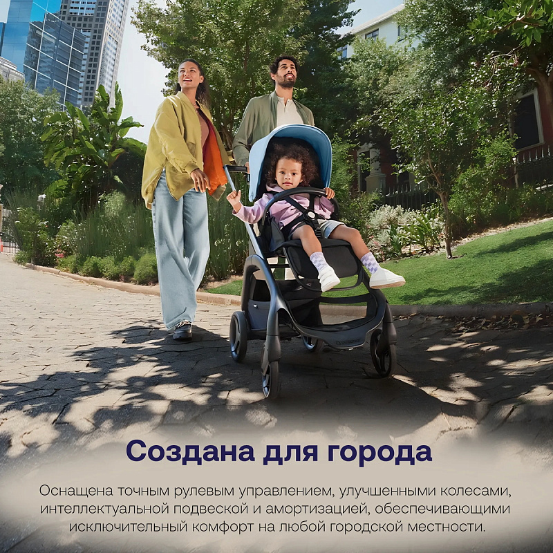 Bugaboo Dragonfly отличается легким рулевым управлением, полной подвеской и высокоэффективными городскими колесами для улучшенного сцепления с дорогой.
