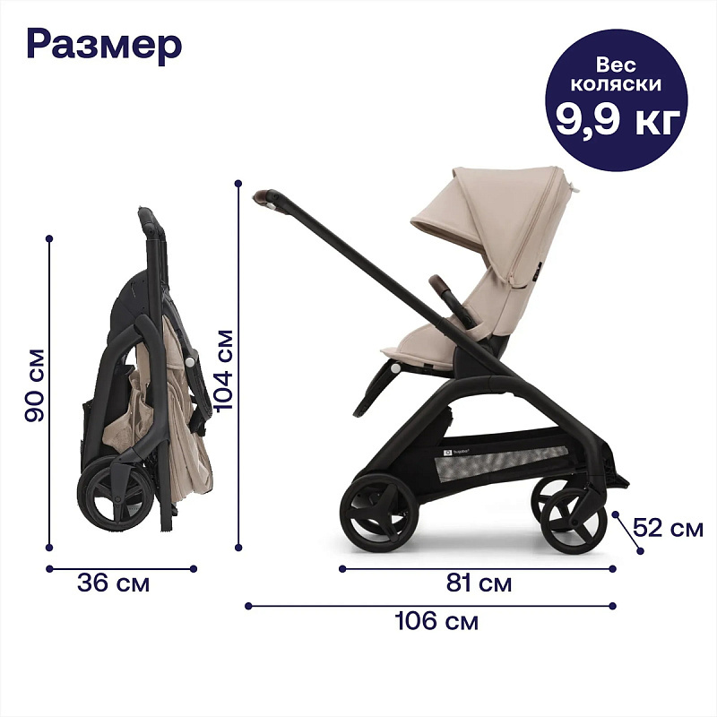Благодаря запатентованной конструкции Bugaboo Dragonfly можно сложить одной рукой в любом положении, не снимая сиденье или люльку. В сложенном состоянии коляска помещается в багажник автомобиля — идеально для передвижений по городу и путешествий. Для удобства переноски предусмотрен плечевой ремень.