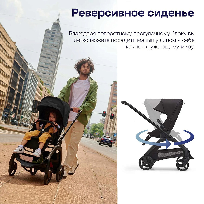 Bugaboo Dragonfly одинаково удобна как для родителей, так и для детей. Прогулочный блок, который разработан для ребенка до 22 кг, можно установить в двух положениях — лицом к родителям или к миру. Просторное сиденье оснащено регулируемыми спинкой и подставкой для ног, поэтому вы всегда можете создать идеальный угол для сна малыша.