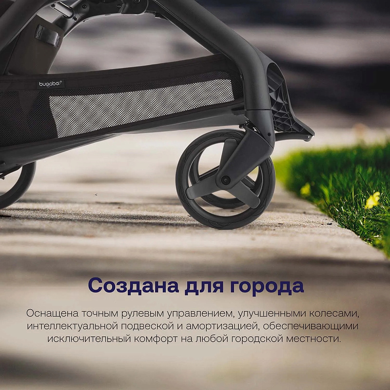 Bugaboo Dragonfly отличается легким рулевым управлением, полной подвеской и высокоэффективными городскими колесами для улучшенного сцепления с дорогой.