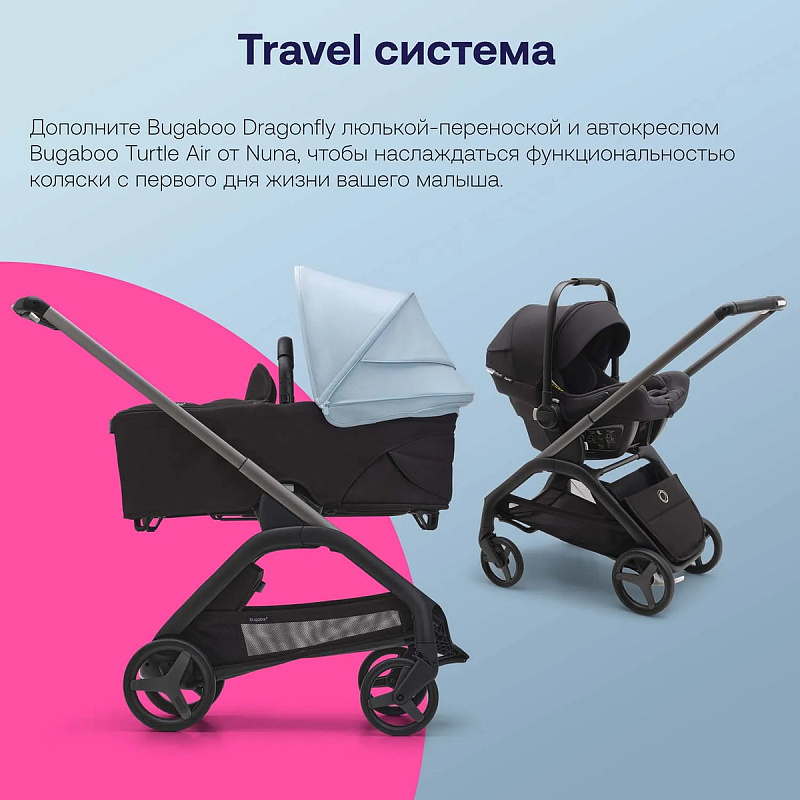 Дополните Bugaboo Dragonfly люлькой-переноской и автокреслом Bugaboo Turtle Air от Nuna, чтобы наслаждаться функциональностью коляски с первого дня жизни вашего малыша.