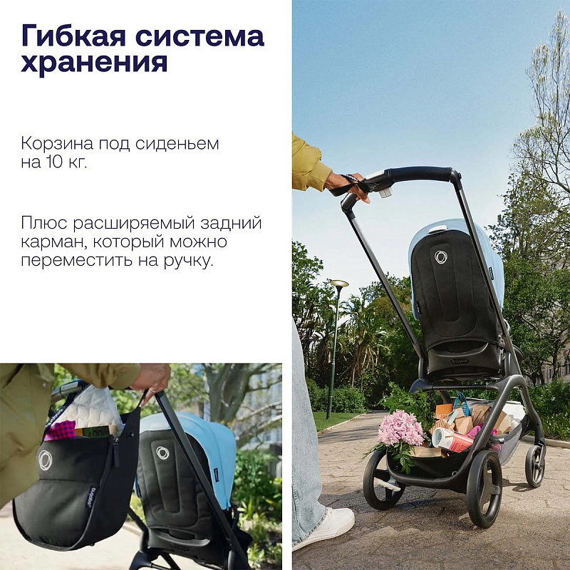 Большая корзина под сиденьем вмещает до 10 кг, а расширяемый задний карман можно переместить вперед, назад или на ручку — туда, где вам это больше всего нужно.