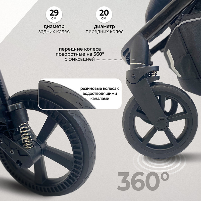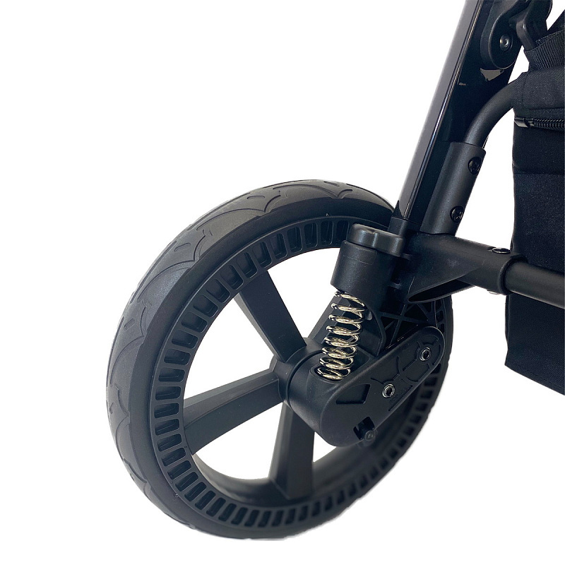 - Большие не прокалываемые колеса с протекцией, пружинами и регулируемой подвеской позволят мягко и комфортно преодолеть любое бездорожье не только во время прогулок в городе, но и на природе. Поворотные передние колеса фиксируются в прямом положении.