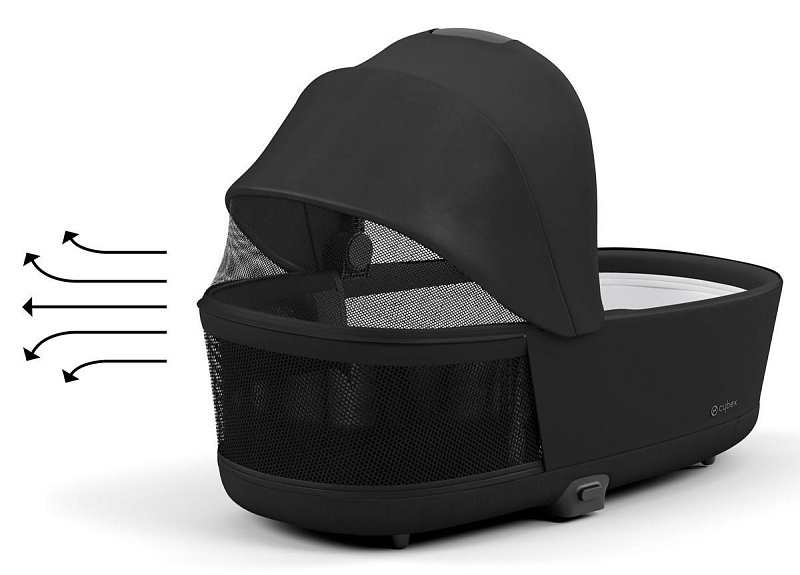 • Отличительной особенностью данной модели является наличие двух панорамных сетчатых вставок на капюшоне и задней панели люльки. Благодаря этому решению даже в жаркую летнюю погоду в люльке поддерживается оптимальный для ребенка микроклимат. А малыш на прогулке может изучать окружающий мир, лежа на животике!